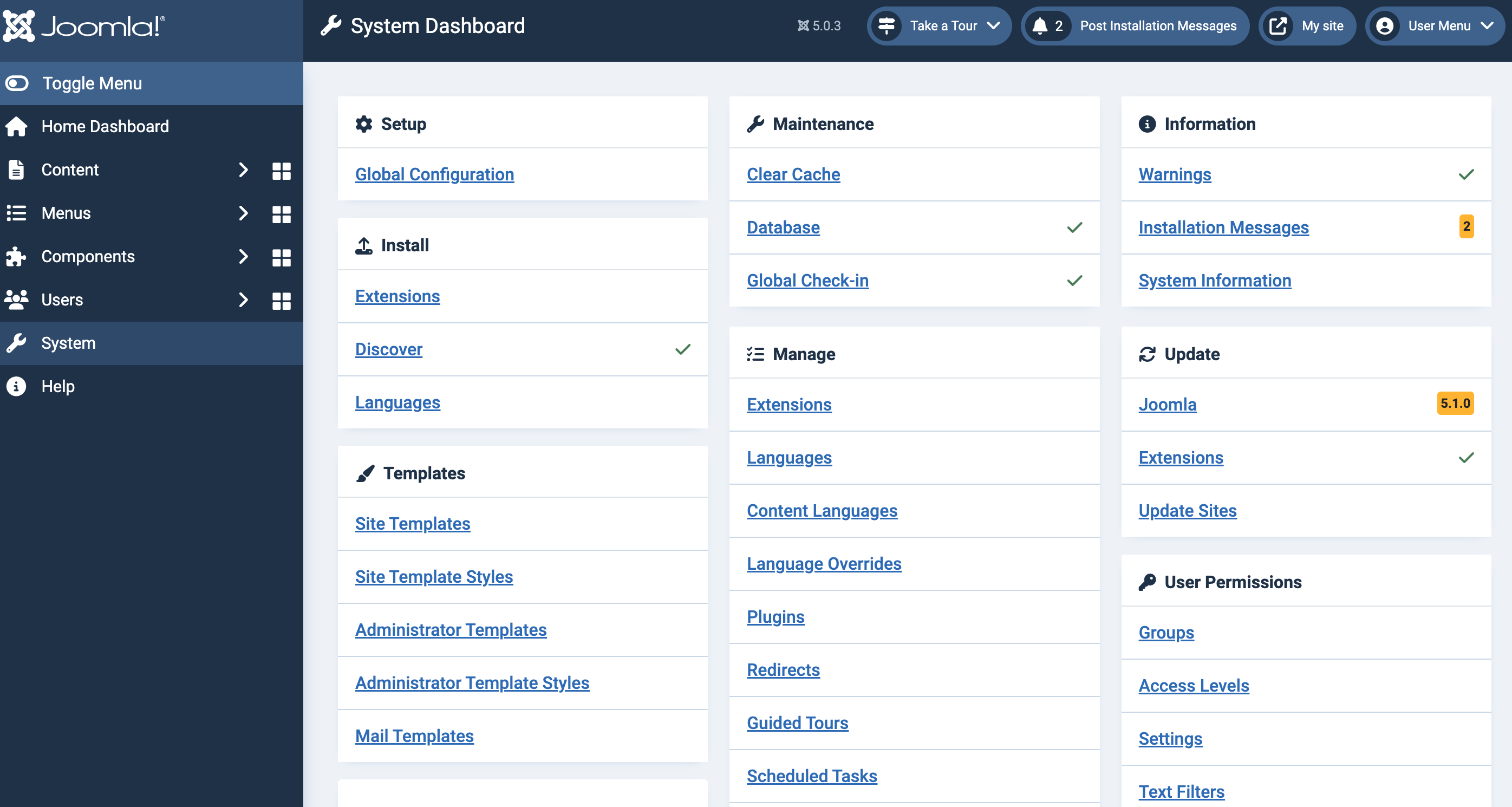 Joomla 具有非常全面的管理与配置能力,主要通过 System 菜单进入: