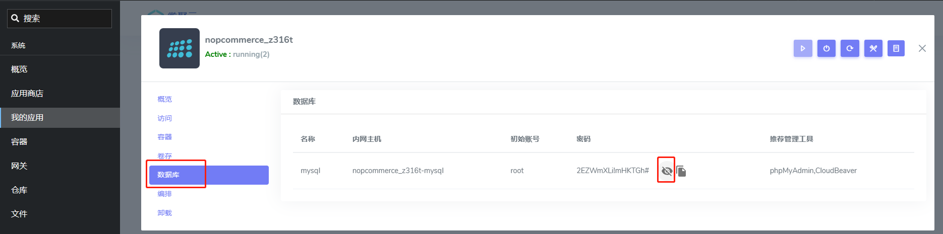Websoft9 控制台安装 nopCommerce 后,通过 "我的应用" 查看应用详情