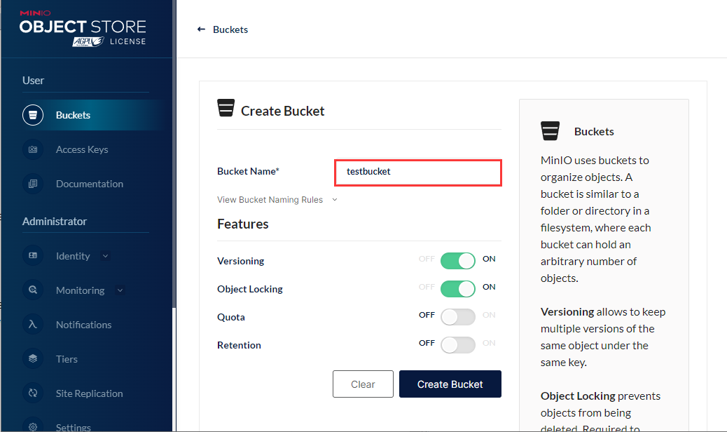 Log in to the backend and click Create Bucket to create a new bucket.