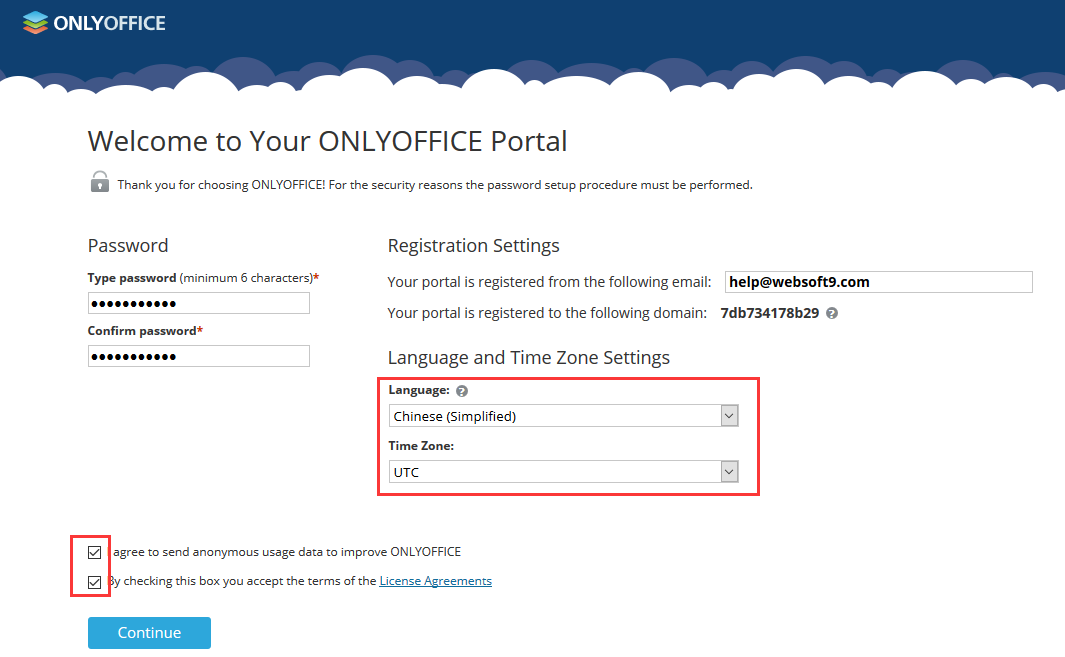 3. Set your password and email address (login name), log in, and start using ONLYOFFICE Workspace.