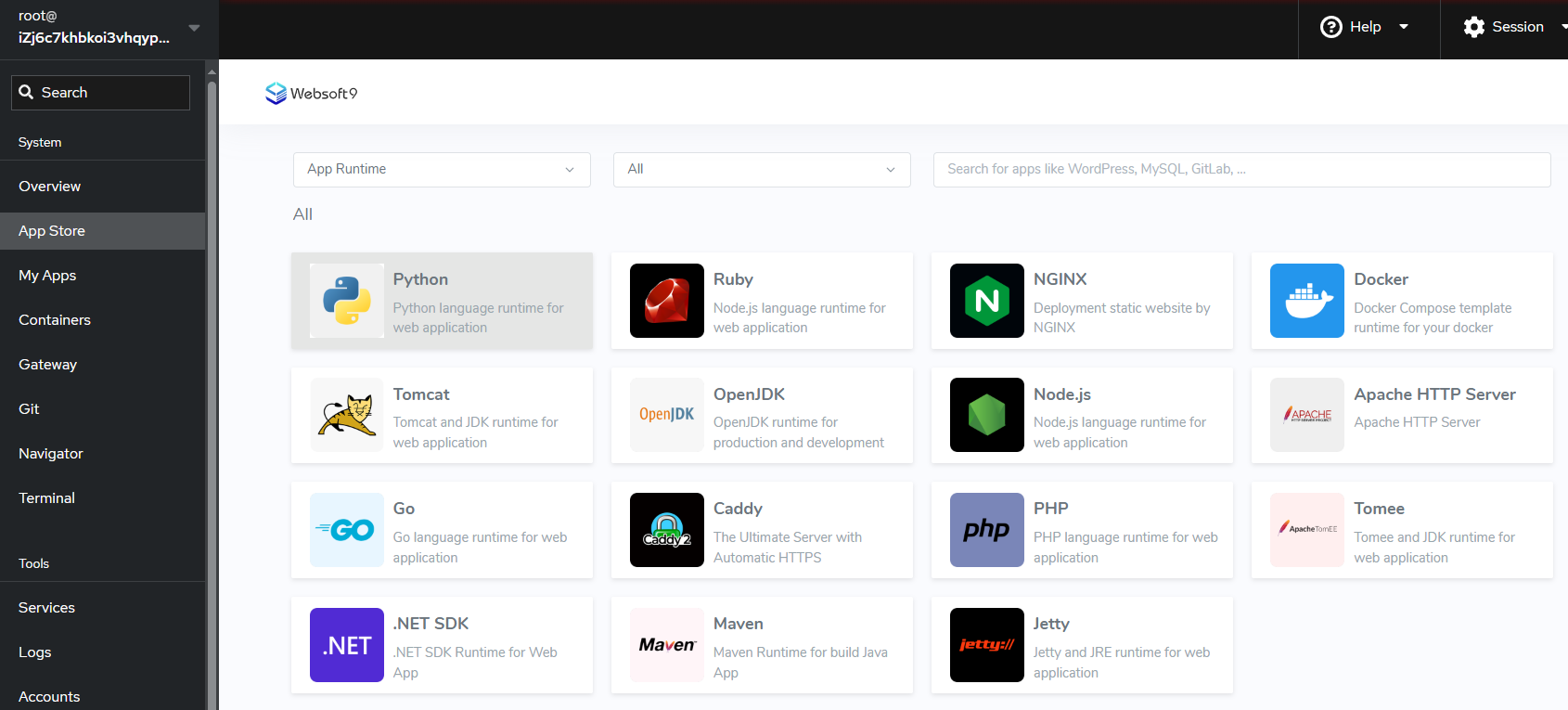 Websoft9 App Runtime enables you to build and host web apps, mobile back ends, and RESTful APIs in the programming language of your choice. It enables automated deployments from GitHub, or any Git repo. It provides a programming language template such as Java, Python, Node.js, PHP, Go, Ruby, and .NET, as well as Docker image and static website deployment.